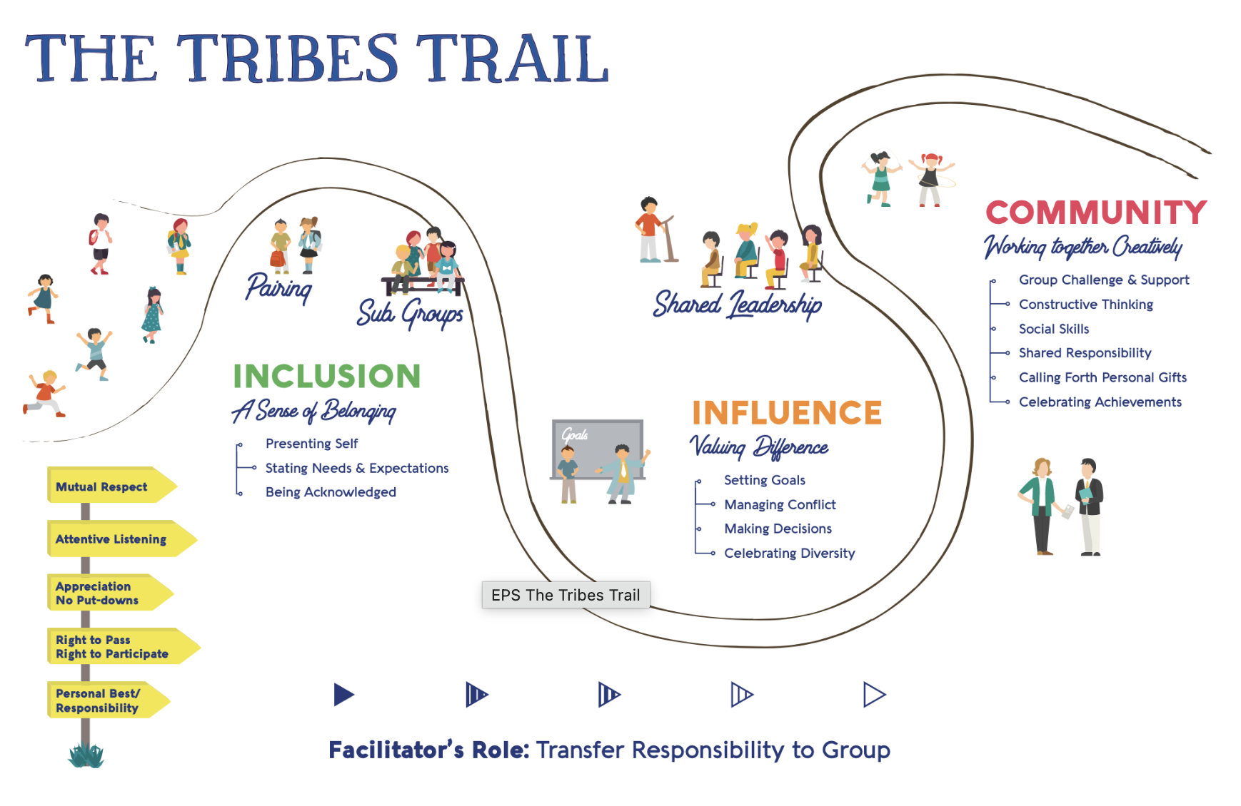 She will tell you, rather immodestly, that she makes the Tribes process work well anywhere. At times, you will want to ignore her calls: “timeout,” “stop the action,” “time to reflect,” or “what’s happening now?” Reflection knows that if you watch from the bird’s eye view, classroom management goes more smoothly. Reflection is a wise bird who can describe just what she saw or hear while people are working together. You will find her questions on the pages of every Tribes strategy. Reflection clears up confusion and helps everyone soar to greater heights.